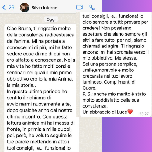 Con la Consulenza Energetica Personalizzata che eseguirò per te a distanza, avrai una Diagnosi Energetica ed in caso Animica, accurata e completa secondo ciò che saranno i tuoi desideri primari e del tuo stato psicofisico: AURA, Chakra Meridiani e Corpi Sottili, con individuazione di Blocchi energetici e relative cause, sia che vengano da questa vita, sia che la causa sia nel lontano passato delle tue esistenze.